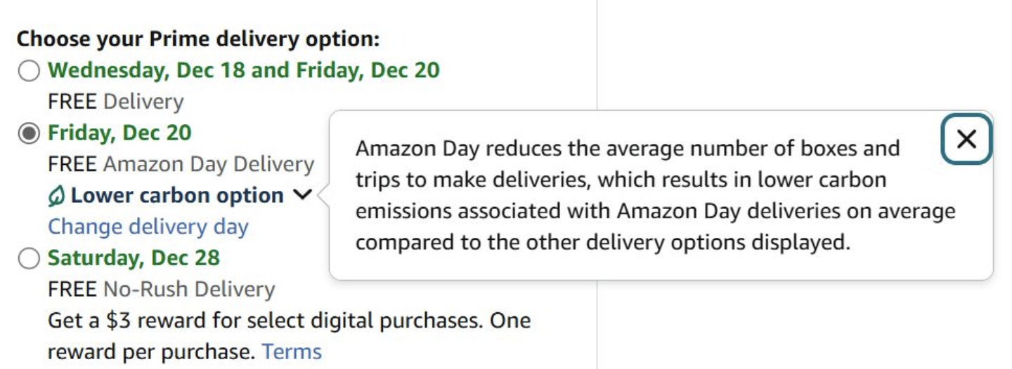 You don’t have to drive a delivery van to participate in low carbon delivery. In fact, Amazon has increasingly placed part of the responsibility on the consumer through the checkout screen.